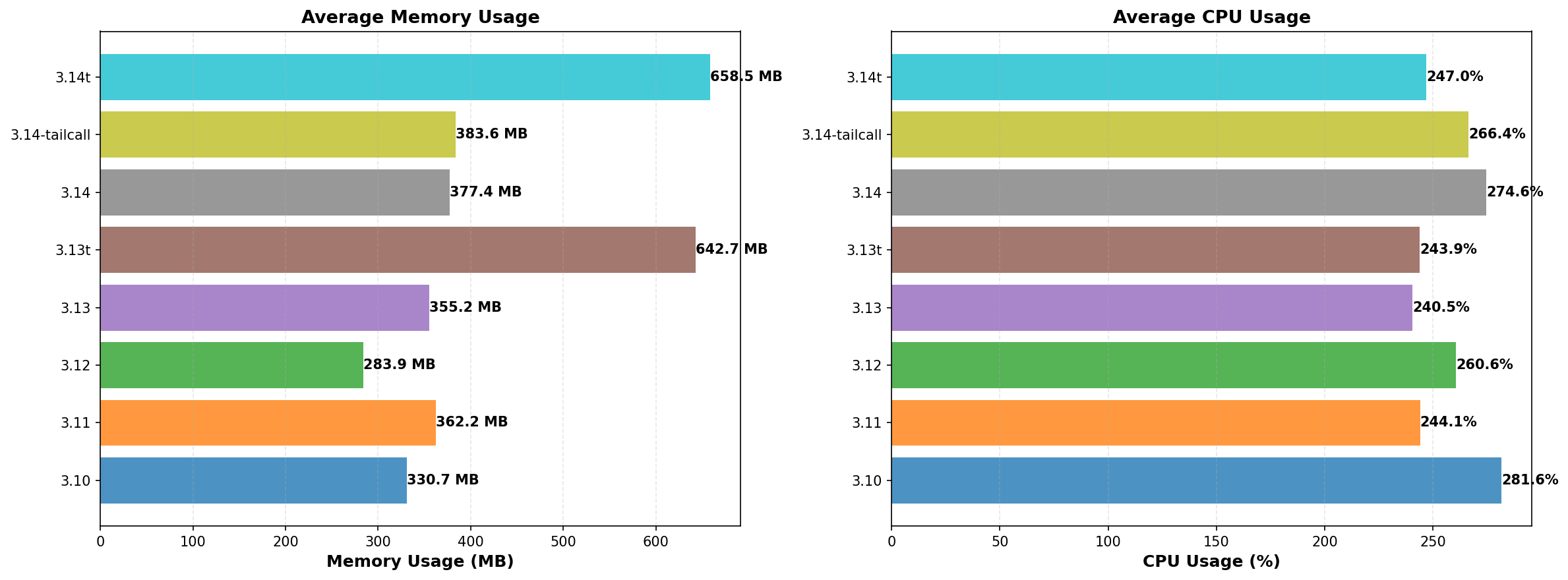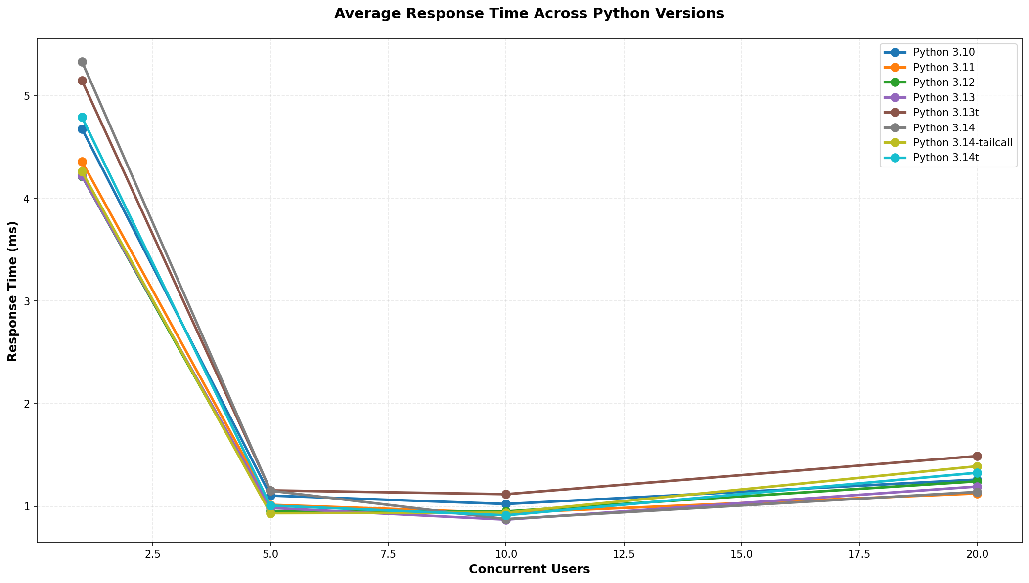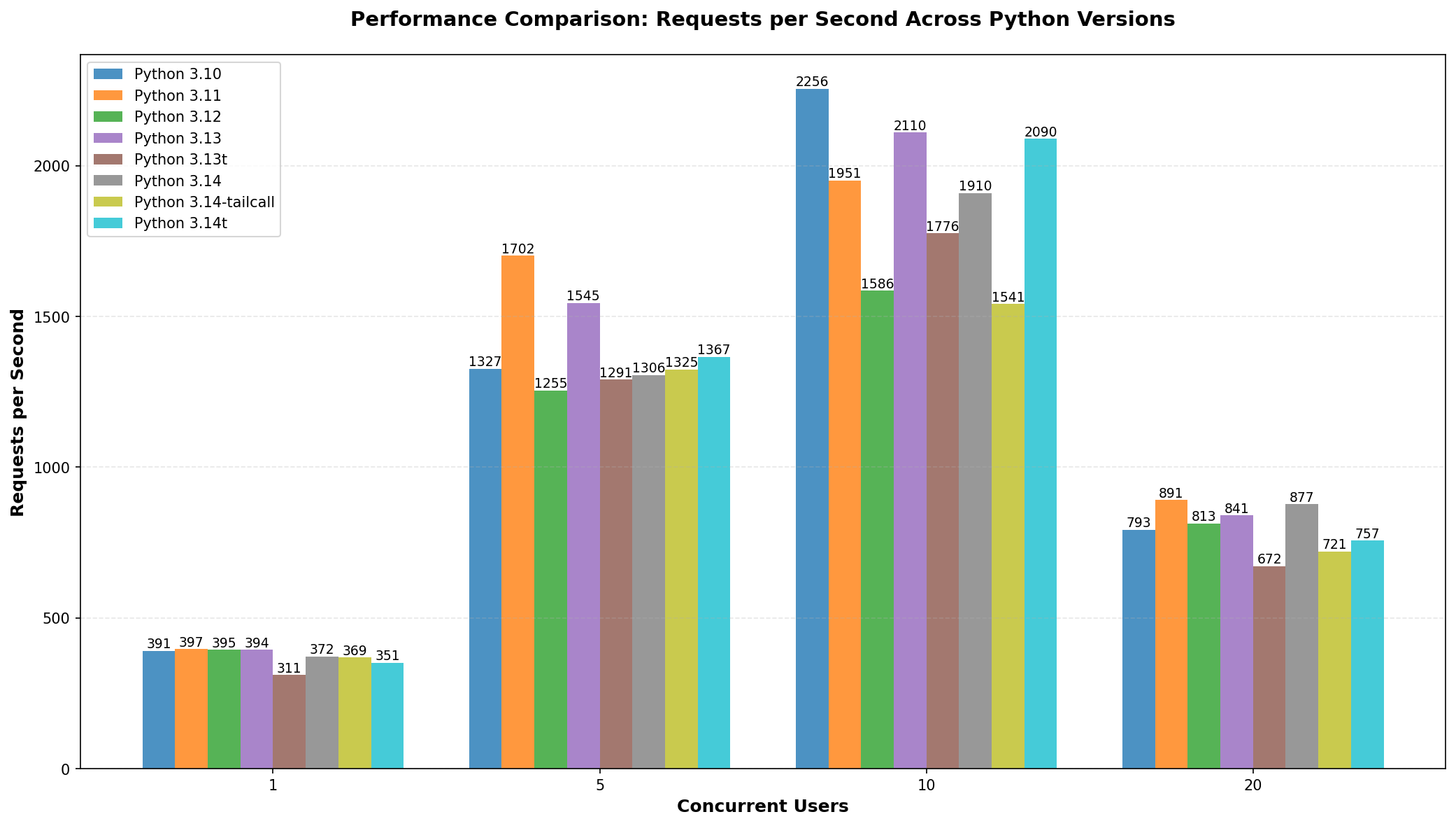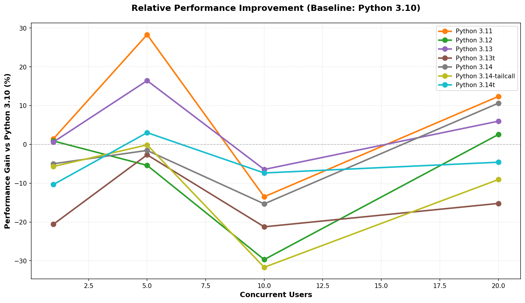 1. Experimental versions are interesting: Python 3.14t (free-threaded) shows some promising results for concurrent workloads, but I'd be careful about using it in production just yet.